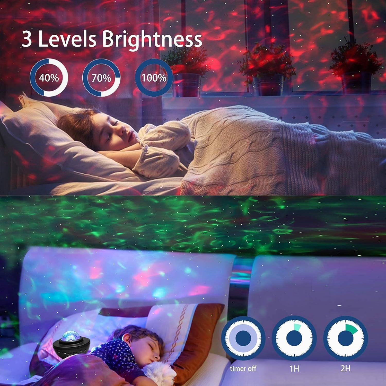 🎶 Built-In Bluetooth Speaker & Remote Control: Enjoy your favorite music by connecting your phone via Bluetooth or using a USB drive. The included remote control lets you switch between ocean wave and starry projection modes, change colors, adjust the speed and brightness, and control the music settings, making it easy to customize your experience.